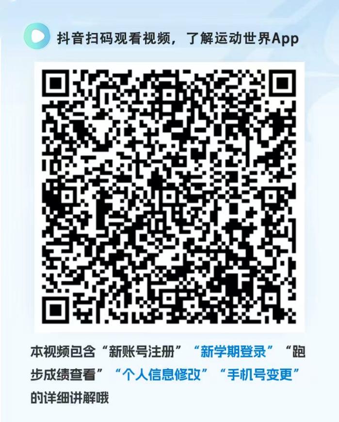 1.观看视频:打开抖音扫描下方二维码,视频内包含“新账号注册”,“新学期登录”,“跑步成绩查看”,“个人信息修改”、“手机号变更”等详细讲解。